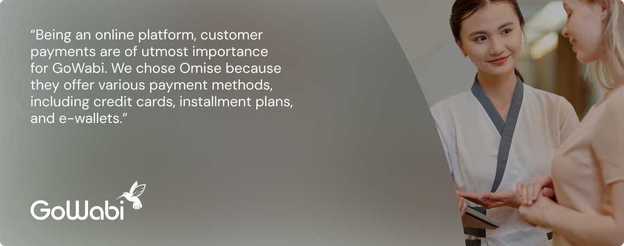 "ด้วยความที่ GoWabi เป็นแพลตฟอร์มออนไลน์ การจ่ายเงินของลูกค้าจึงเป็นสิ่งที่สำคัญที่สุด เราเลือกโอมิเซะเพราะว่ามีวิธีการชำระเงินที่หลากหลาย ไม่ว่าจะเป็นบัตรเครดิต การผ่อนชำระ หรืออีวอลเล็ต"