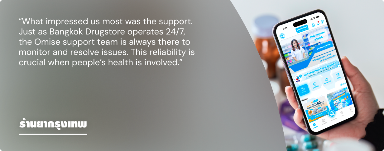 “เมื่อมี Omise ดูแลระบบการชำระเงินอยู่เบื้องหลัง ร้านยากรุงเทพจึงสามารถโฟกัสกับสิ่งที่ถนัดอย่างการดูแลสุขภาพของผู้คนได้อย่างเต็มที่ ทุกที่ และทุกเวลา”